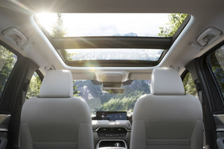 Panoramic SunroofThe CX-60 features a panoramic roof that offers a wide field of view and brings plenty of light into the cabin. The 950 mm (W) x 1,021 mm (L) panoramic roof and its peripheral parts were meticulously designed to allocate as much surface area to the window as possible to increase the field of view and light range for passengers in the rear seats. |